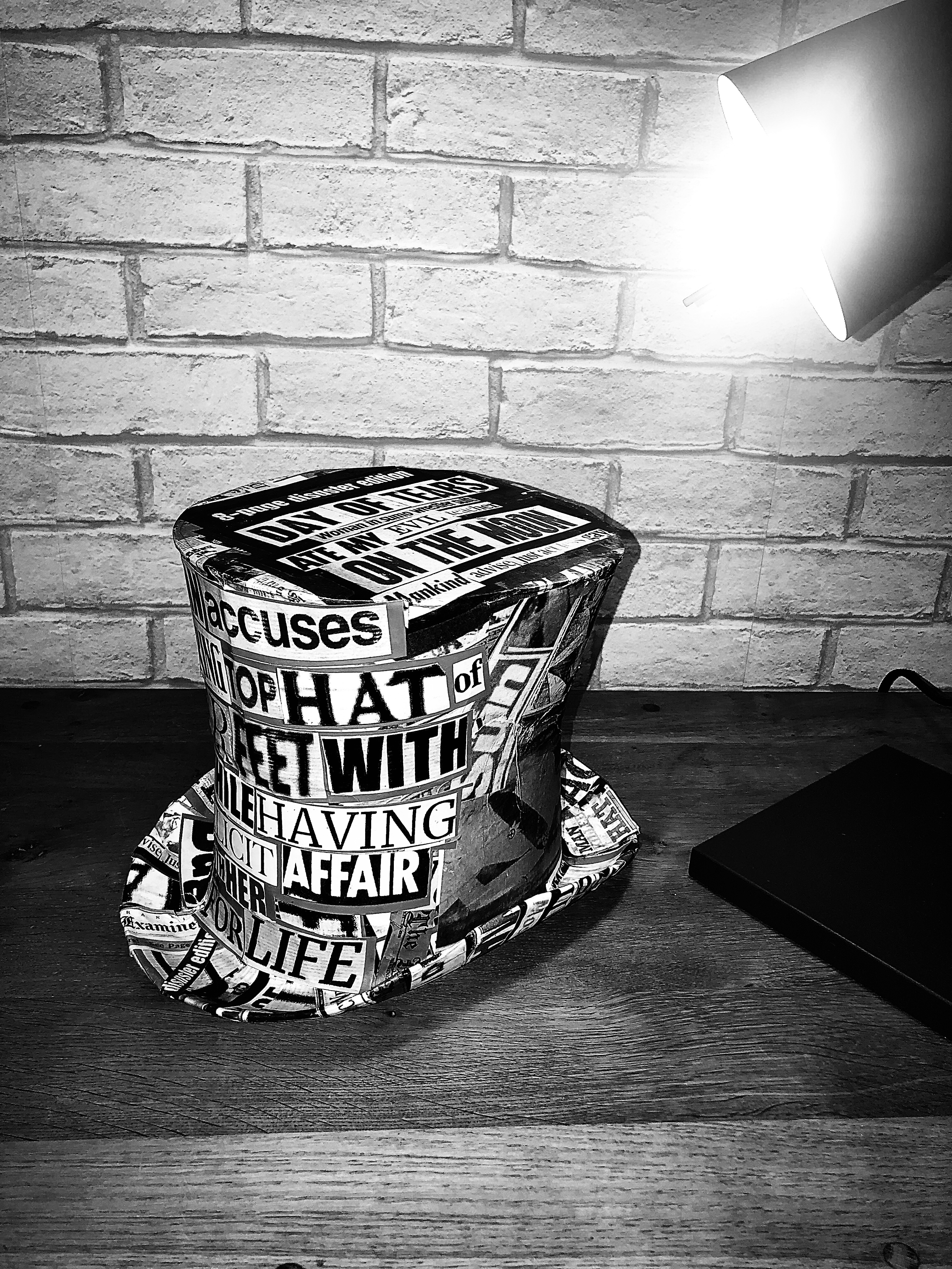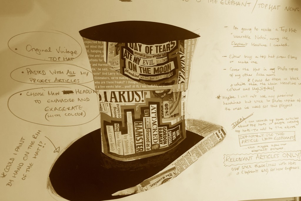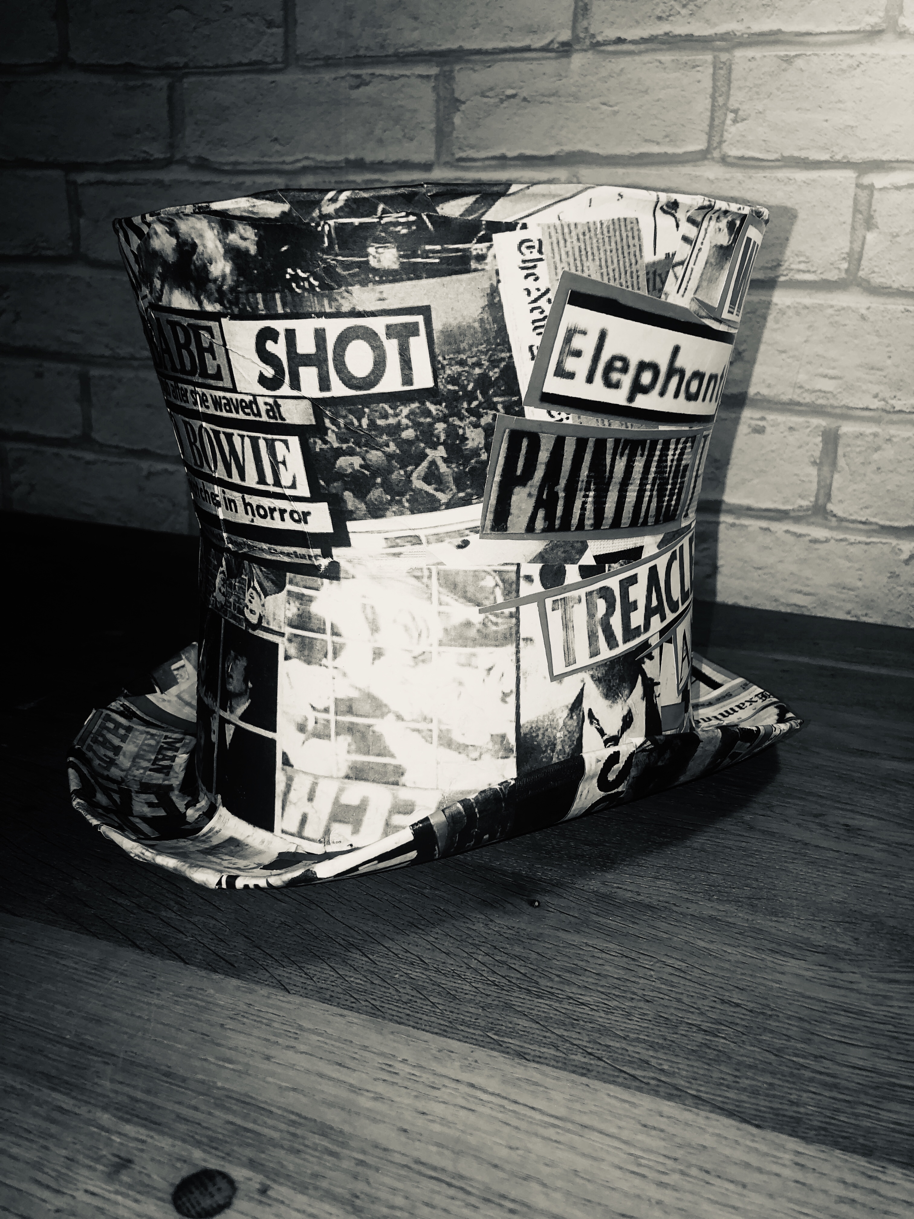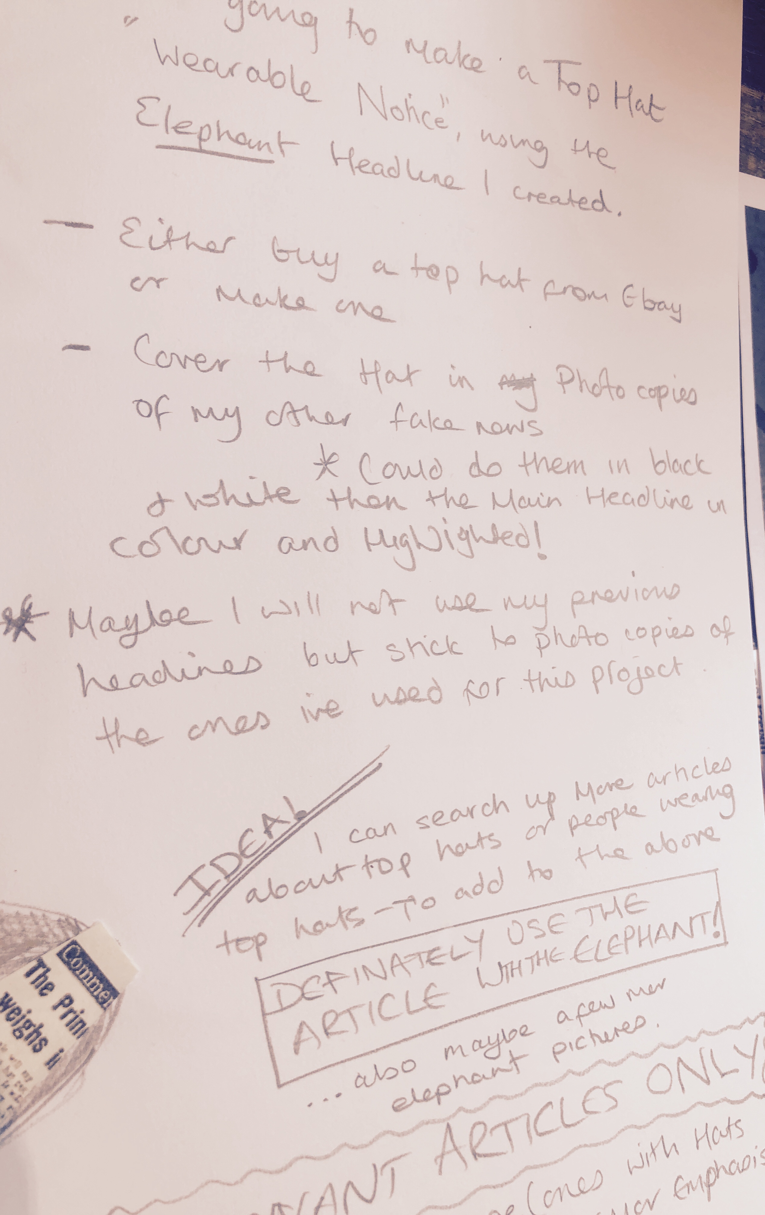 I produced a top hat to display my favourite headline and covered it with my other one first all in mono. The main one being on the front in full colour. A tophat was chosen because an elephant donning a tophat was mentioned in the chosen story, obviously.