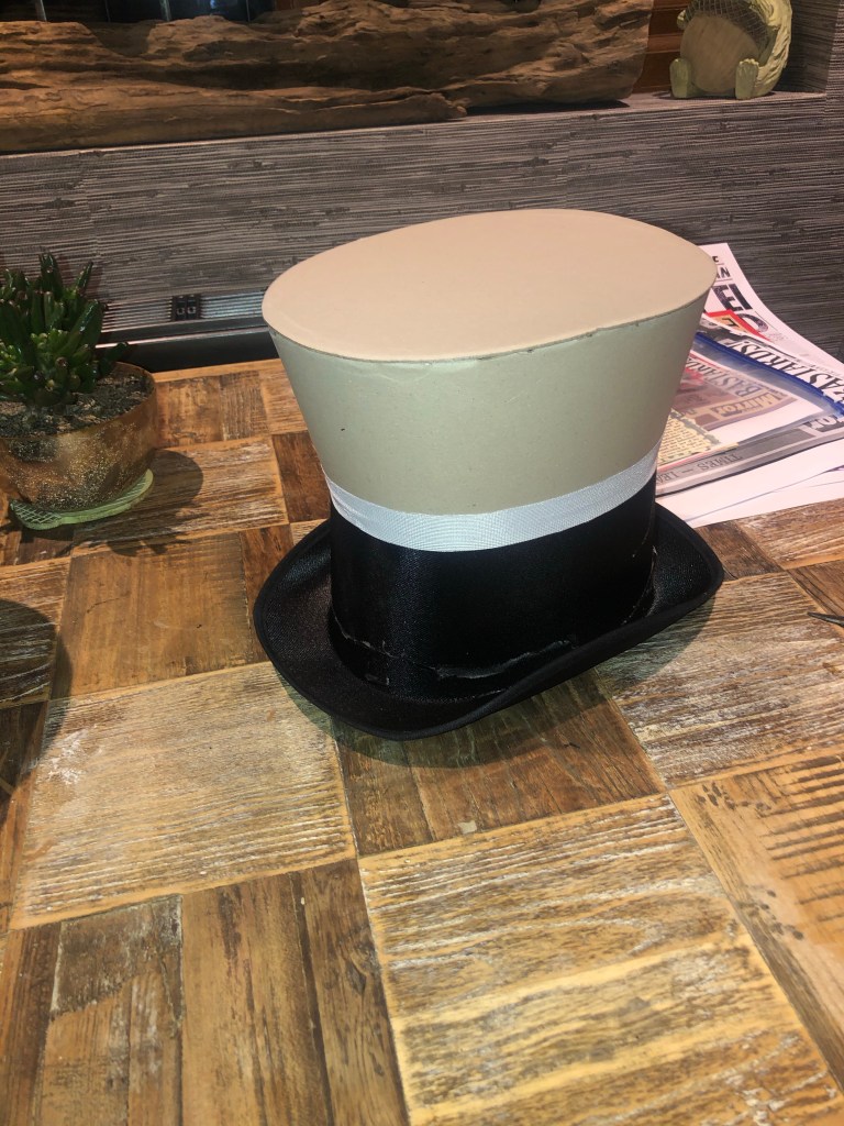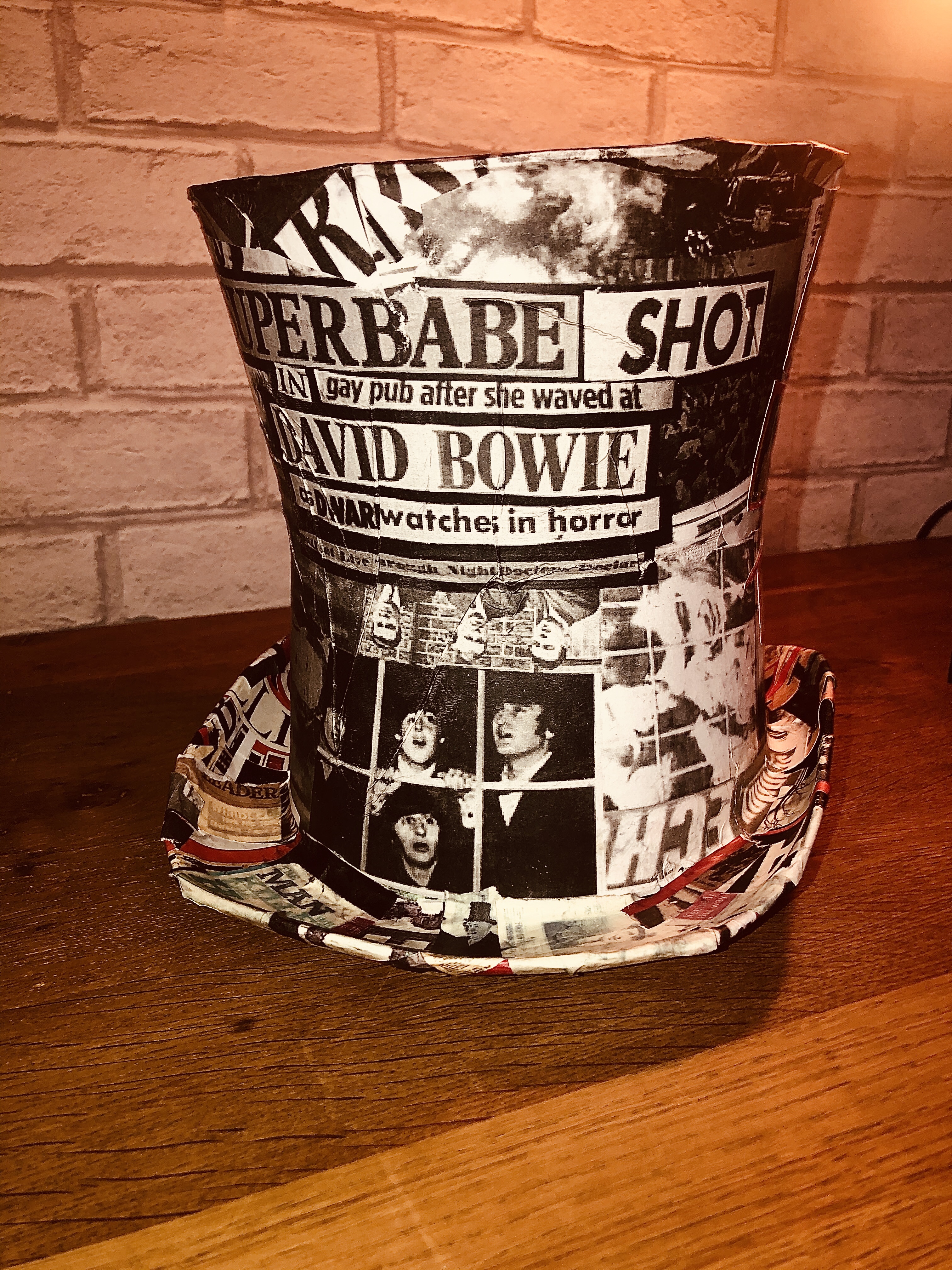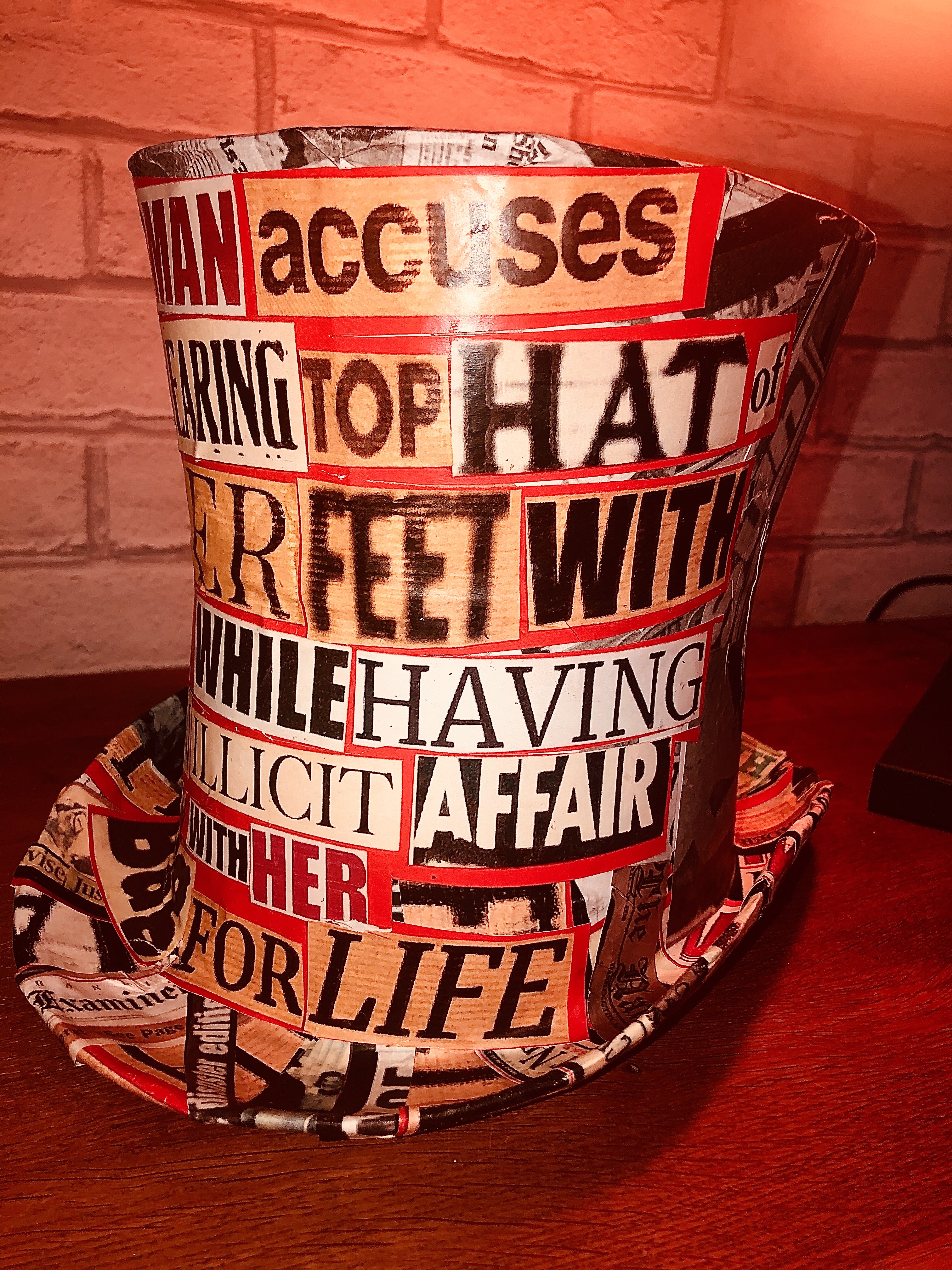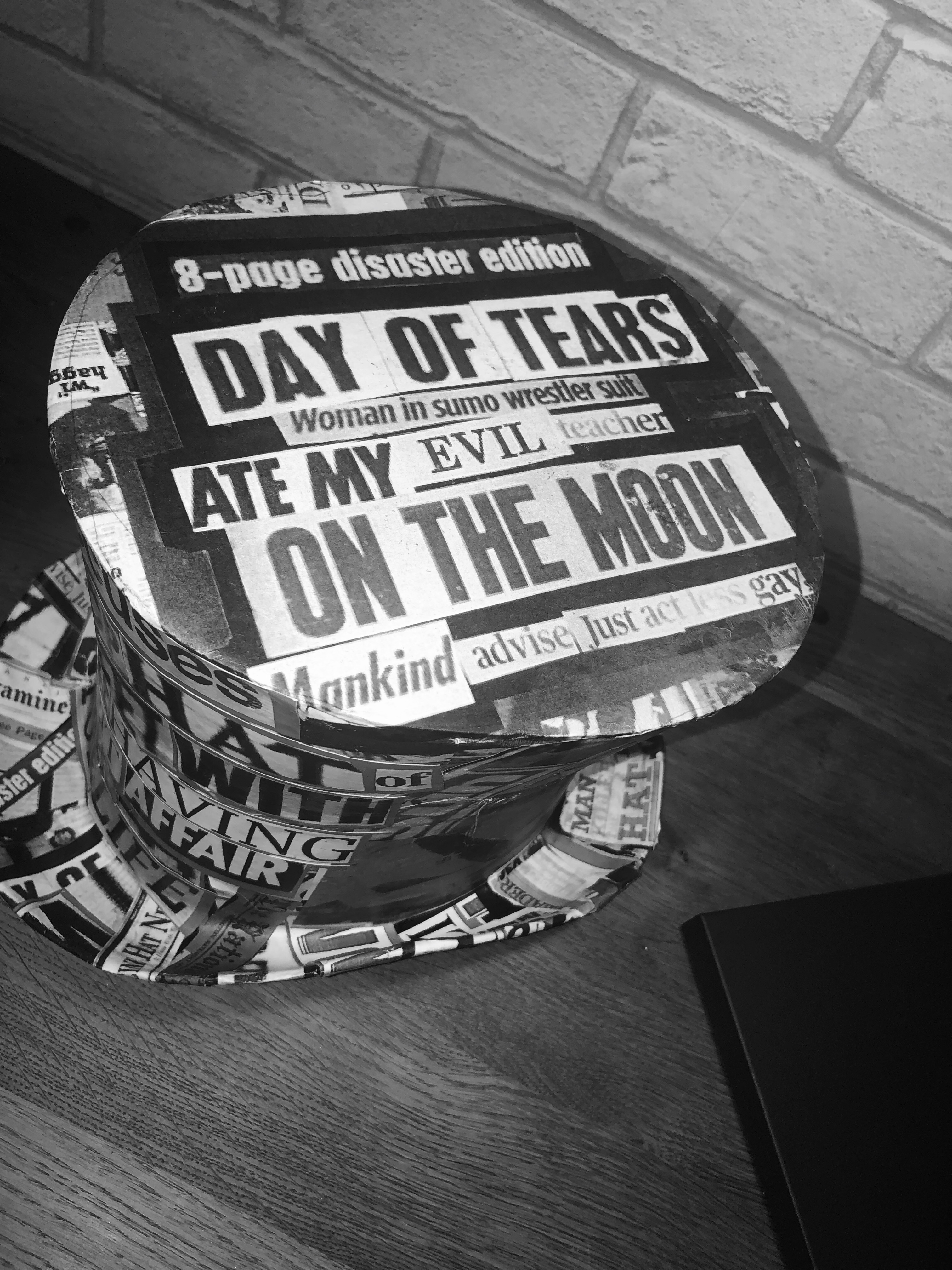 I produced a top hat to display my favourite headline and covered it with my other one first all in mono. The main one being on the front in full colour. A tophat was chosen because an elephant donning a tophat was mentioned in the chosen story, obviously.