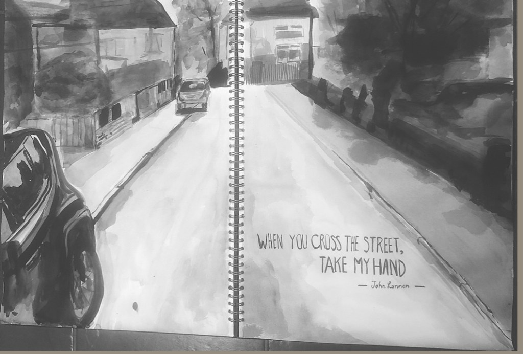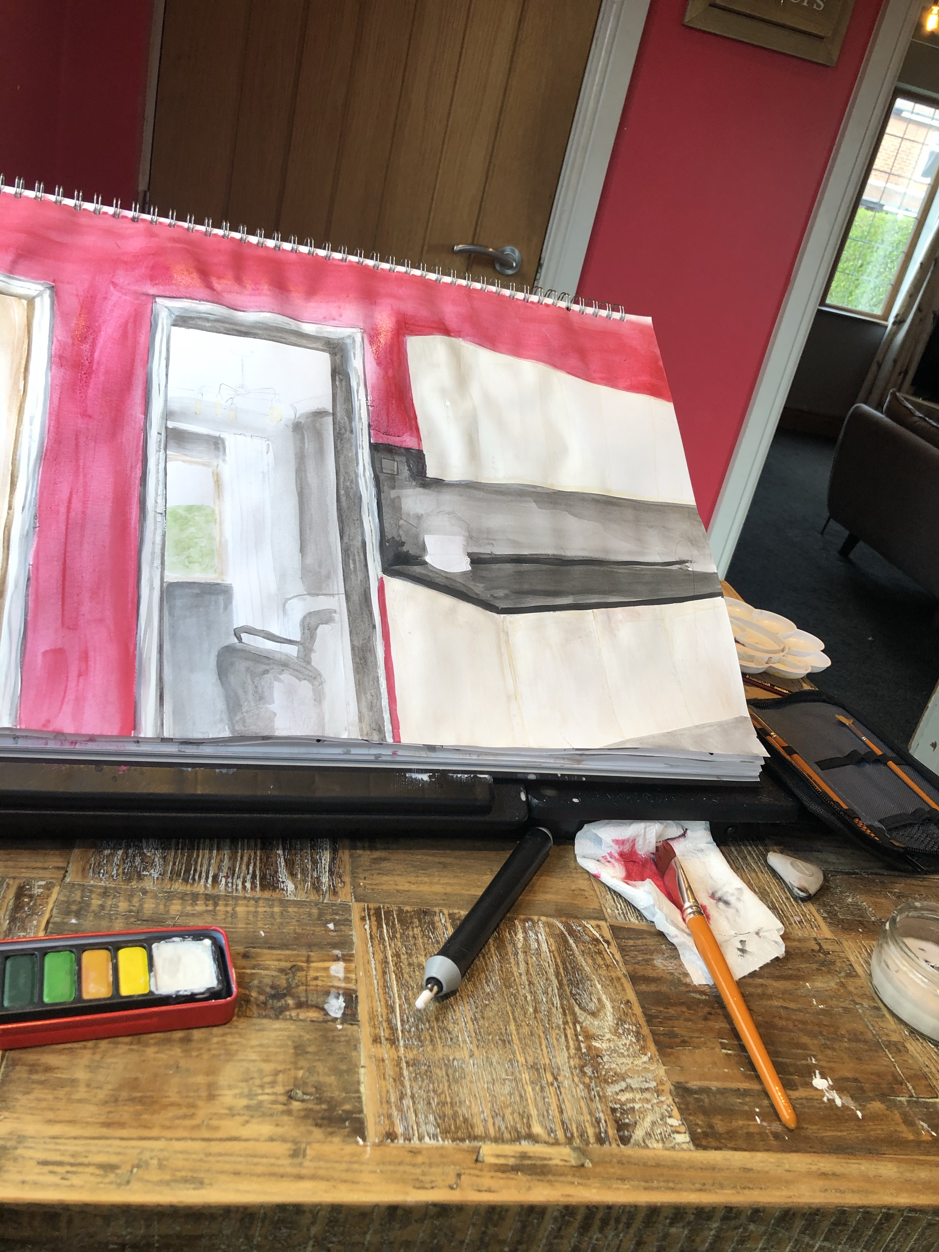 “Make a PANORAMIC drawing by extending the pages of your sketchbook. This drawing will be long, thin and horizontal but still needs to include near, mid and far elements, both architectural and natural. Use considered, careful colour.”