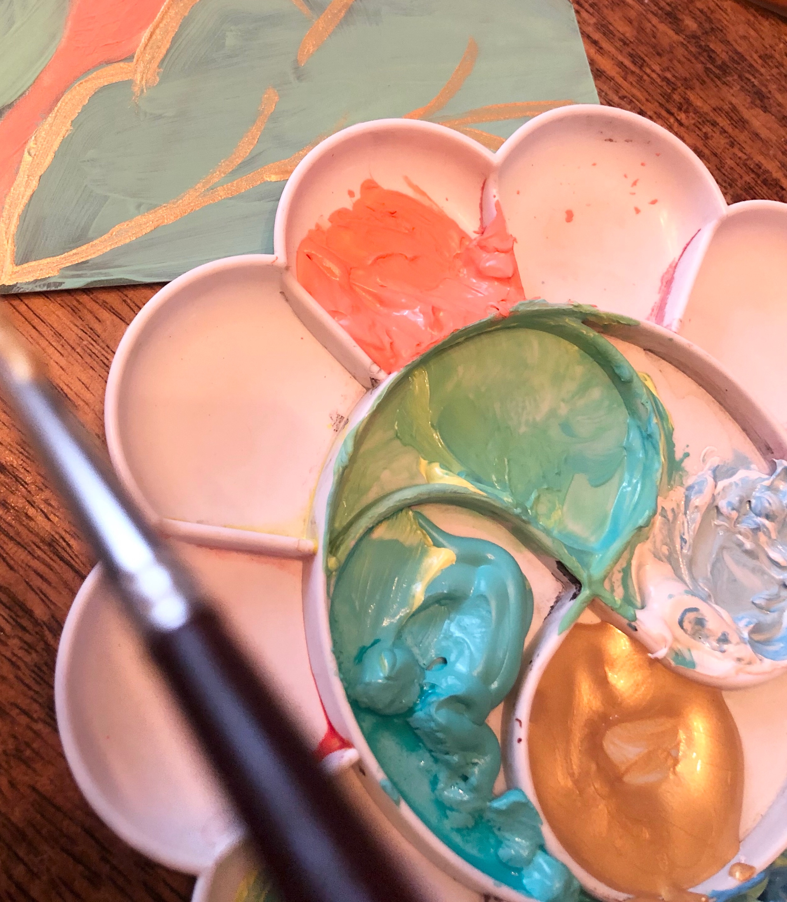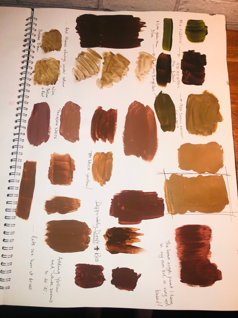 Initially I used a premixed brown acrylic paint and tried to work in some yellow tone. The brown I’d chosen was too much of a red base and just came up sludgey. I decided to start from scratch, mixed a green up then added a small amount of red and a teen bit of white, all the while being careful to try remember the “recipe”…. which proved difficult – so I’ve taken little snapshots of the amounts I added each time. I know – I’m a genius!!