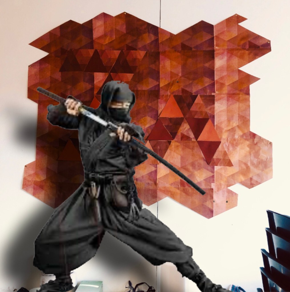 A capital letter, a lower case letter, a colour and a bunch of relevant words to choose from. A very random project, I thought at first. Mixing colours was the first task and then creation of a huge design for the classroom wall. This was enjoyable for me … but i really liked doing the 5 photographs. Superimposing ninjas standing in front of my work as it was displayed in the class and giving another piece some comic glasses to rock! Very entertaining and again something i’ve not done before. I think each of the outcomes of this brief went well.