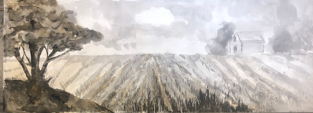 Back to the evaluation you’re hopefully more interested in though. My preferred piece in this section was the panoramic view over the field to the barn. I threw a little sepia wash in the ‘near’ and I think that counted toward the detail closer to me. I could have done with making the barn a little more vague though, more of a shape in the distance. I’ve learned from it though. And that’s what i’m here to do.