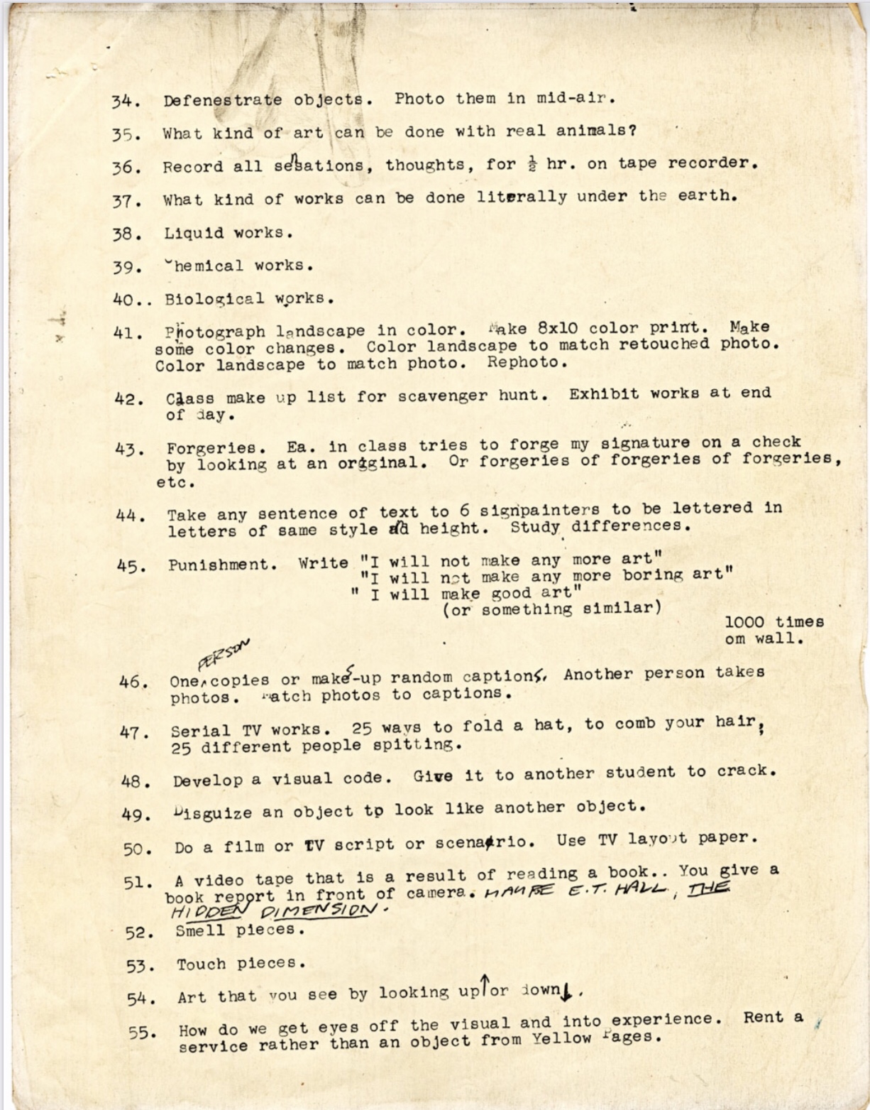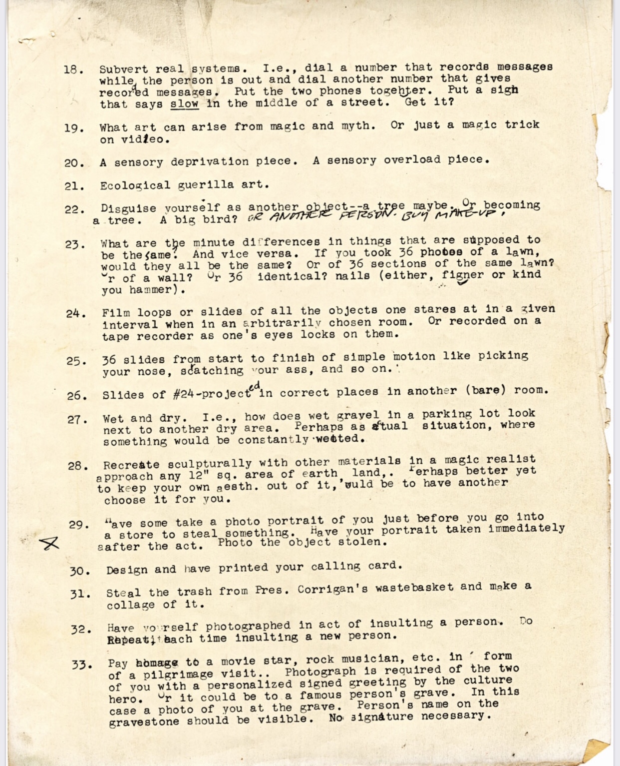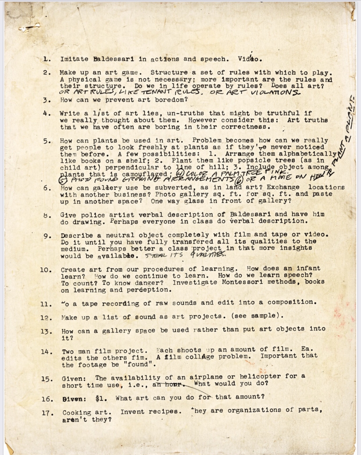 “John Baldassari was an influential conceptual artist who also taught at CalArts. Inspired by his class assignments from 1970. Choose 5 to complete at home.