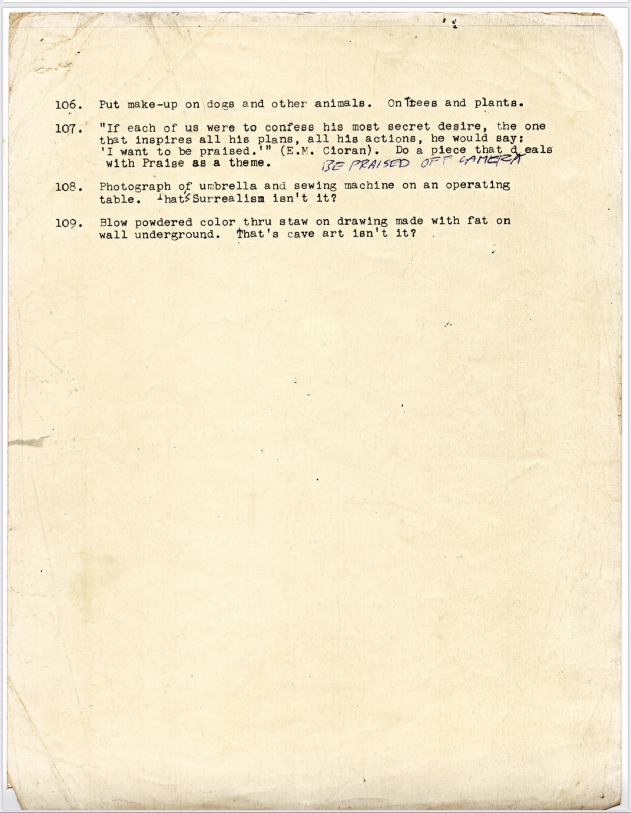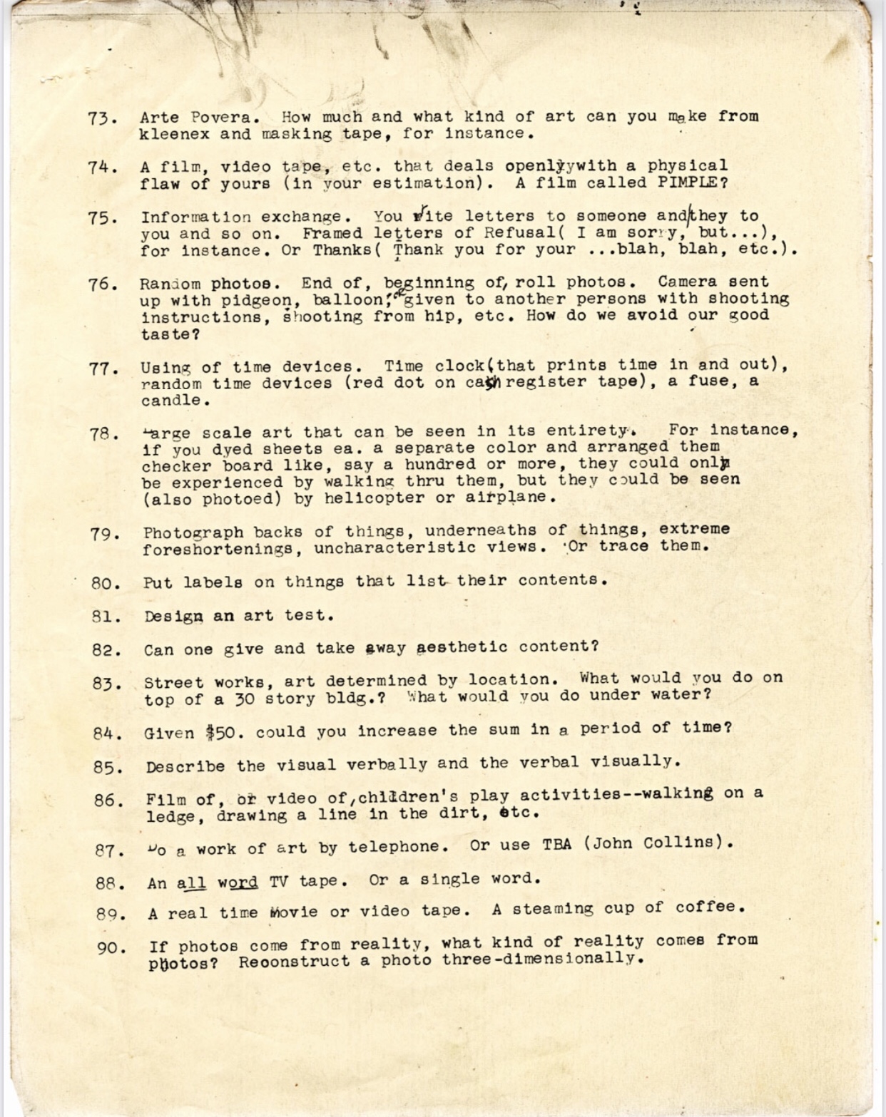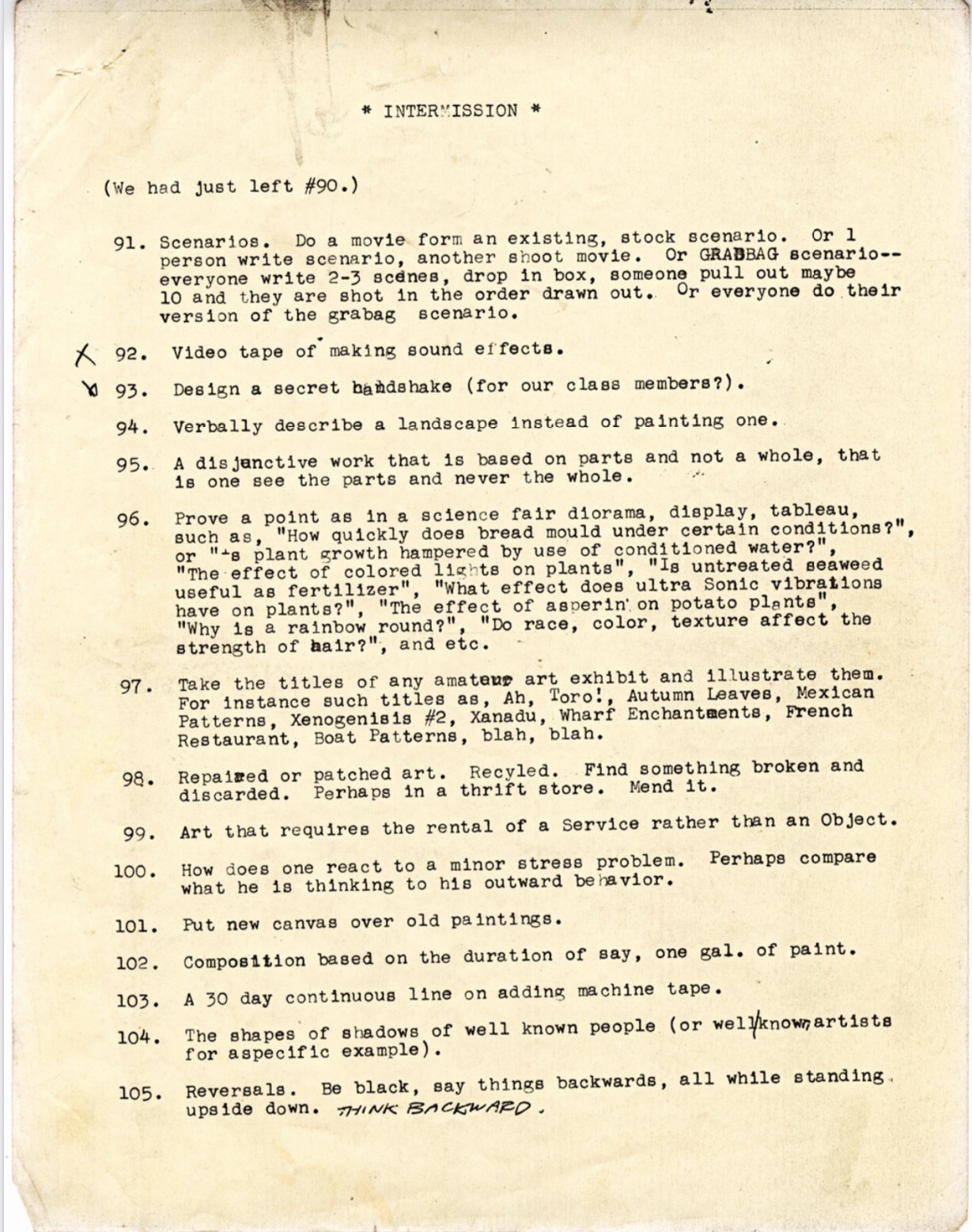“John Baldassari was an influential conceptual artist who also taught at CalArts. Inspired by his class assignments from 1970. Choose 5 to complete at home.