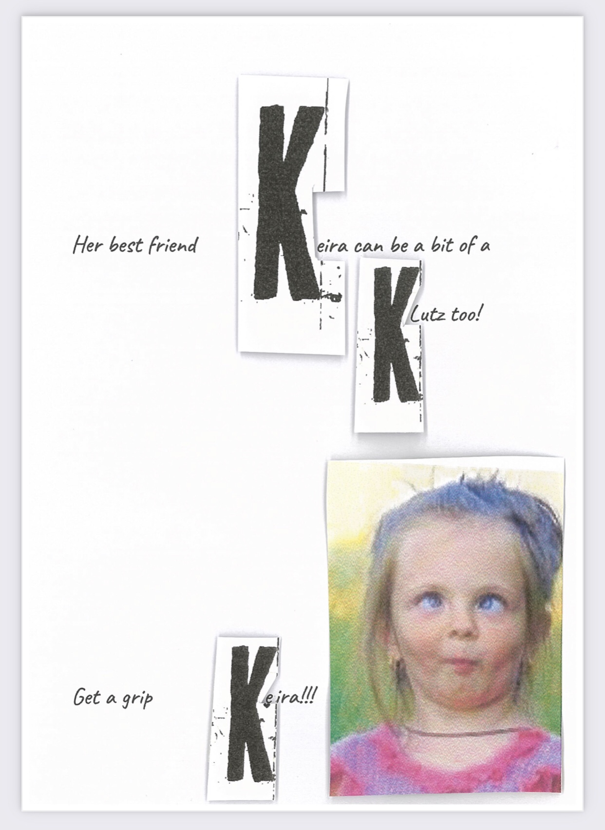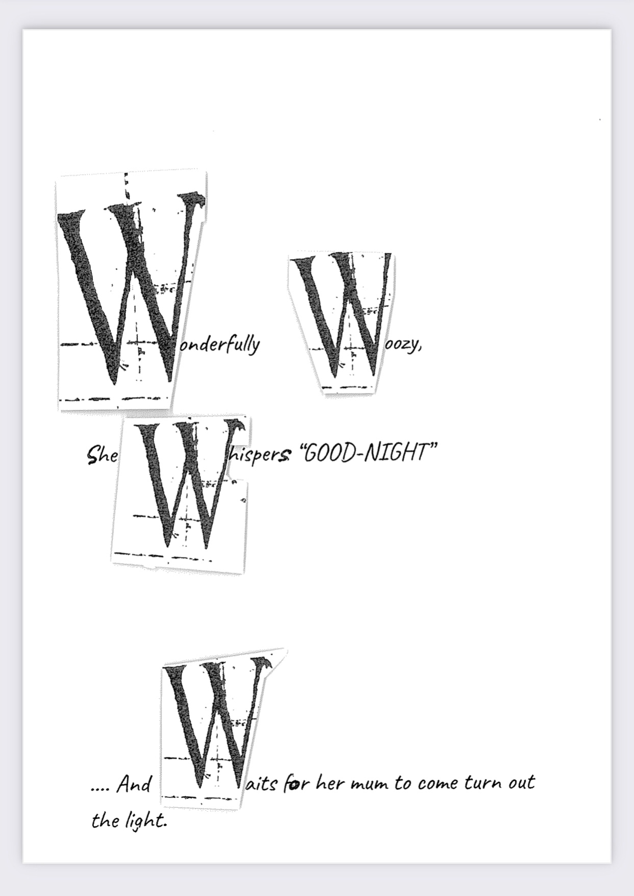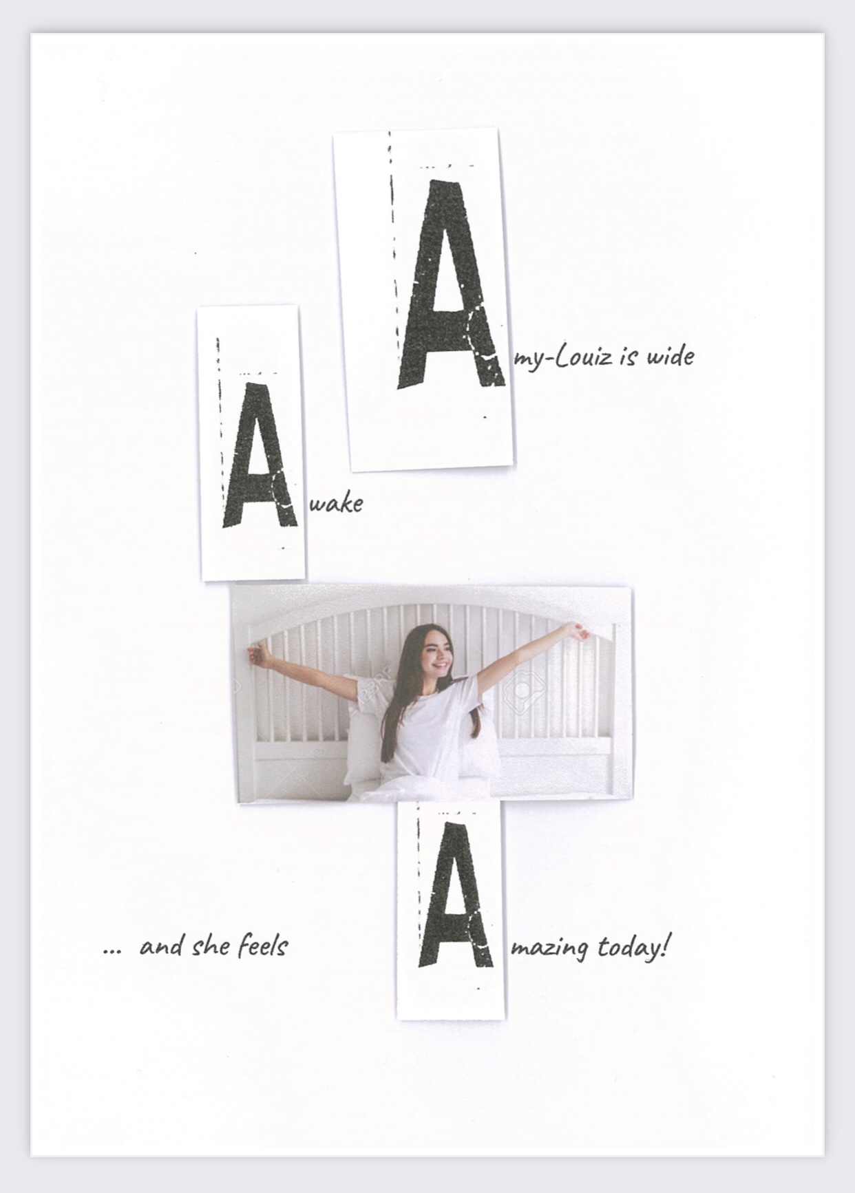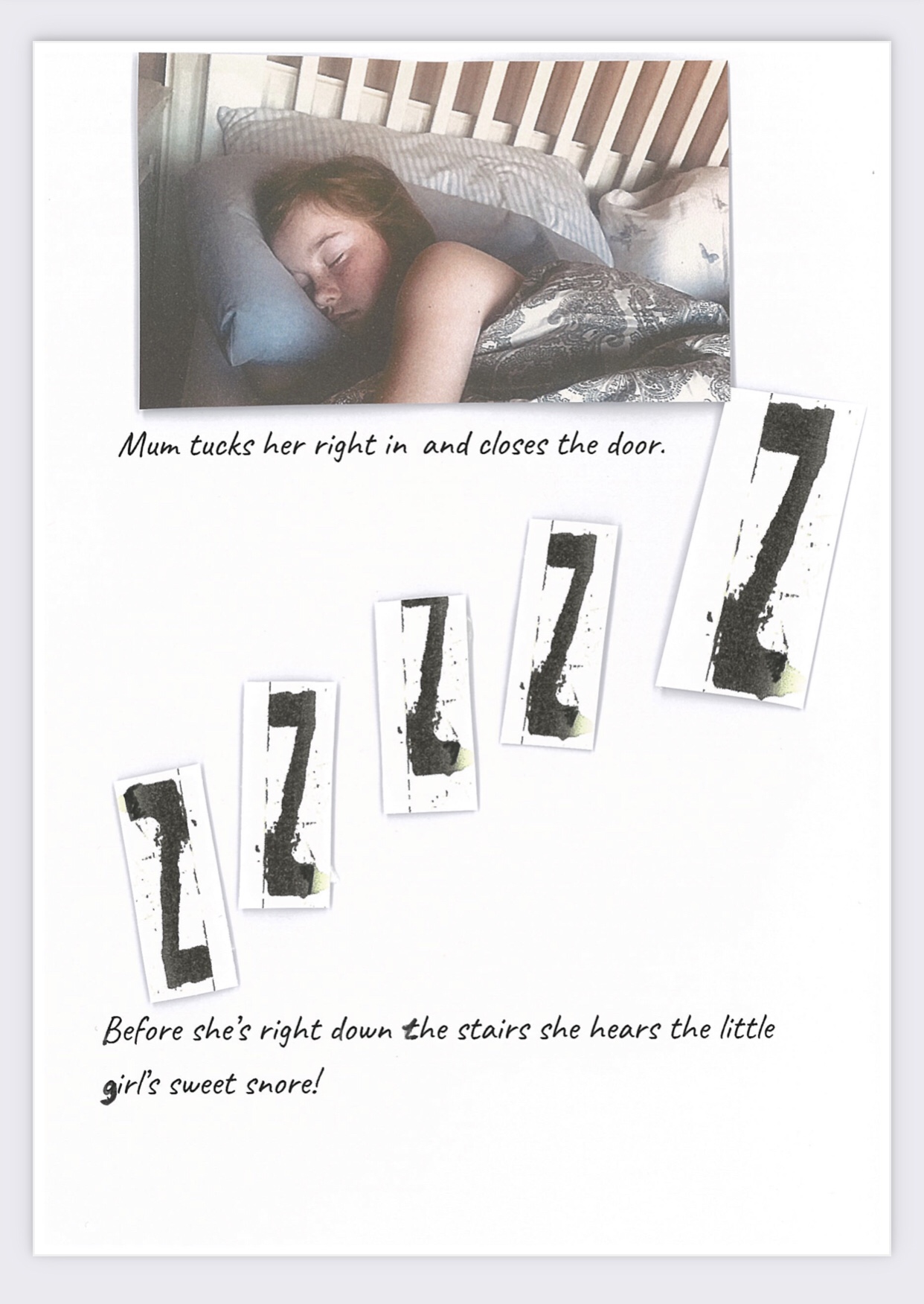 My little girl, Eden features in quite a few of the pages and here I have got her to lay on the floor in a couple of positions and taken photos of her, while stood on a chair. I have then super imposed them onto a black background, using an app on my phone (SuperImpose), added my lettering (TextArt) and printed it out on to gloss paper. The photos could have been of better quality but time was against me at this point.