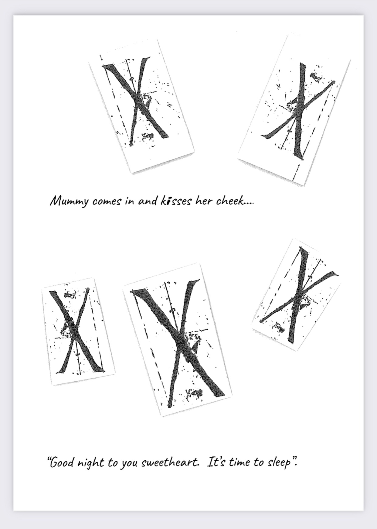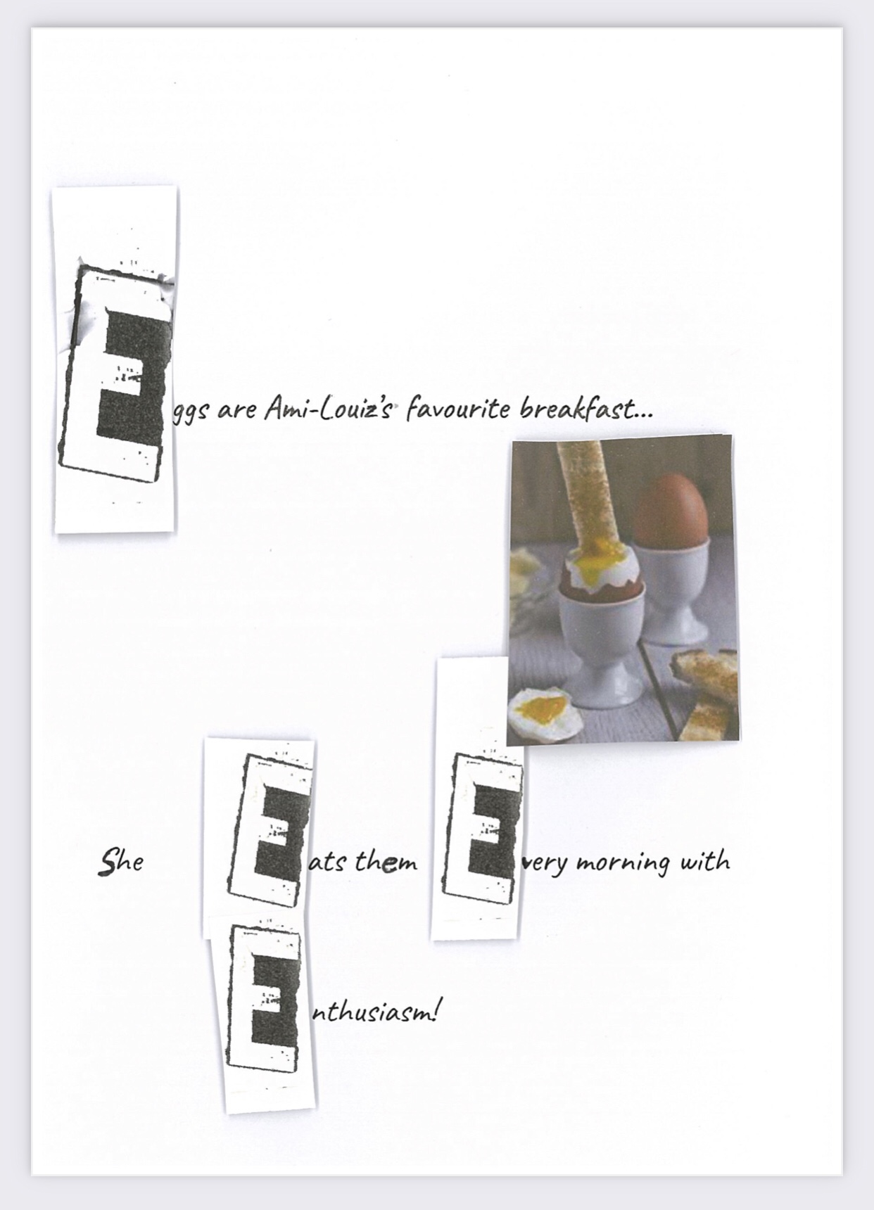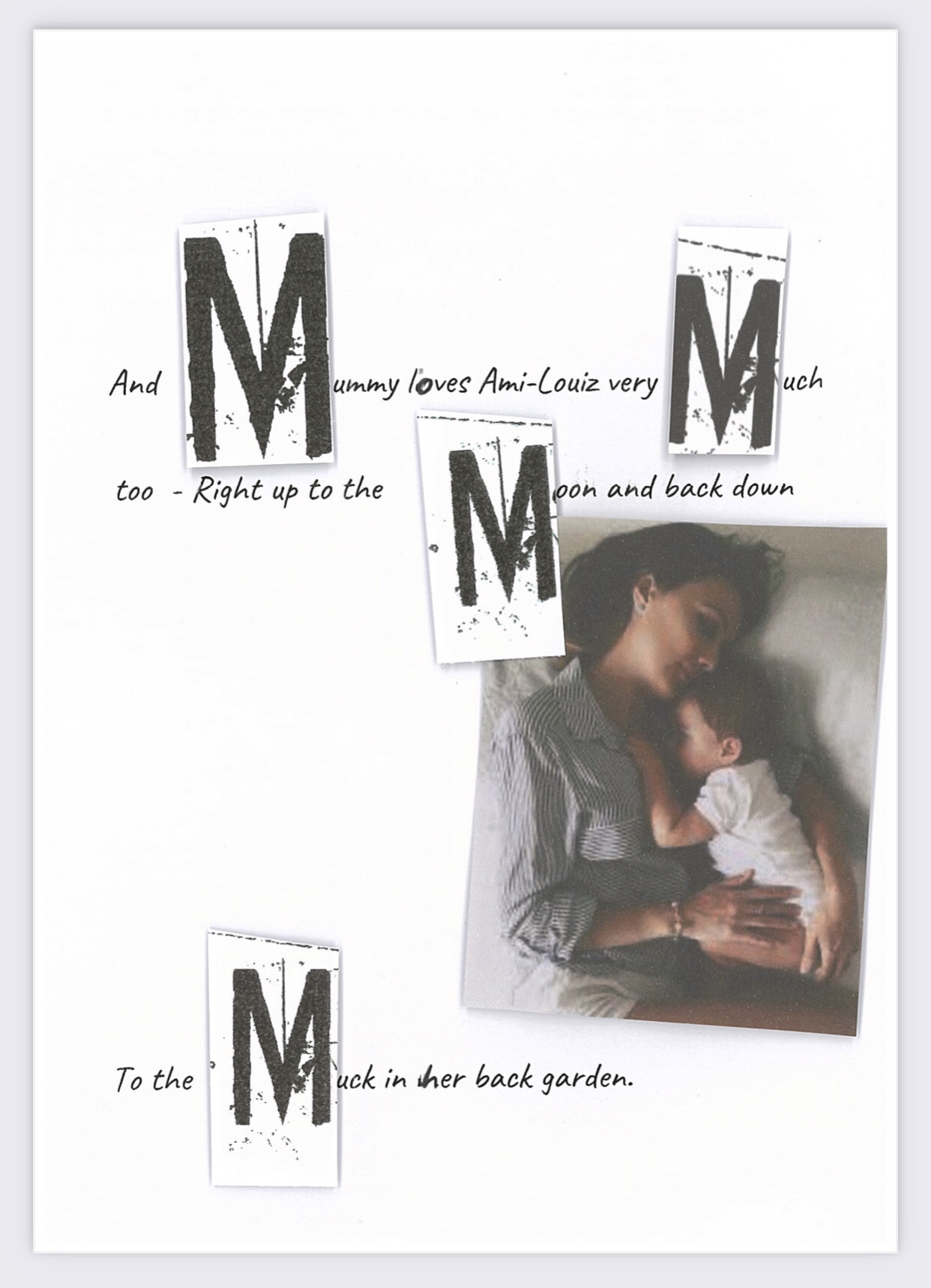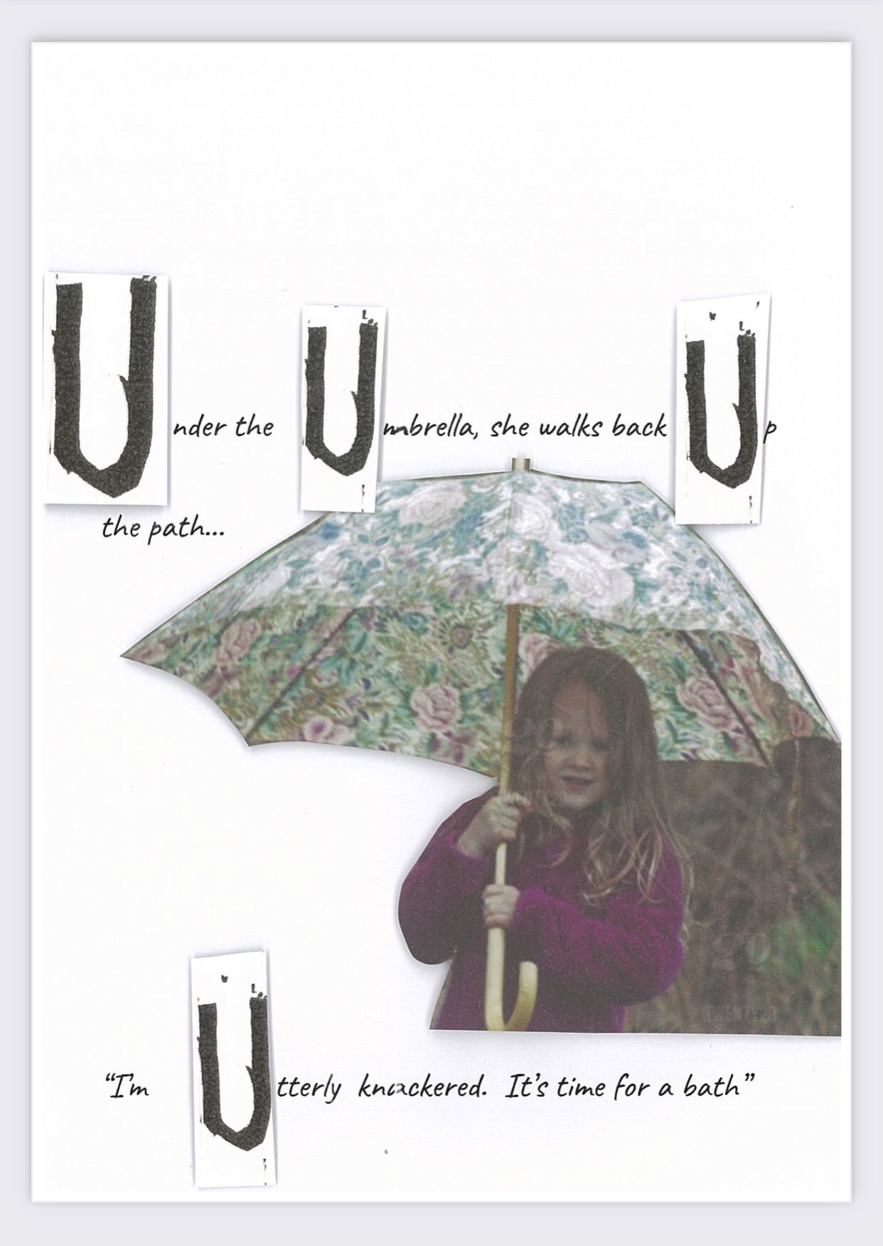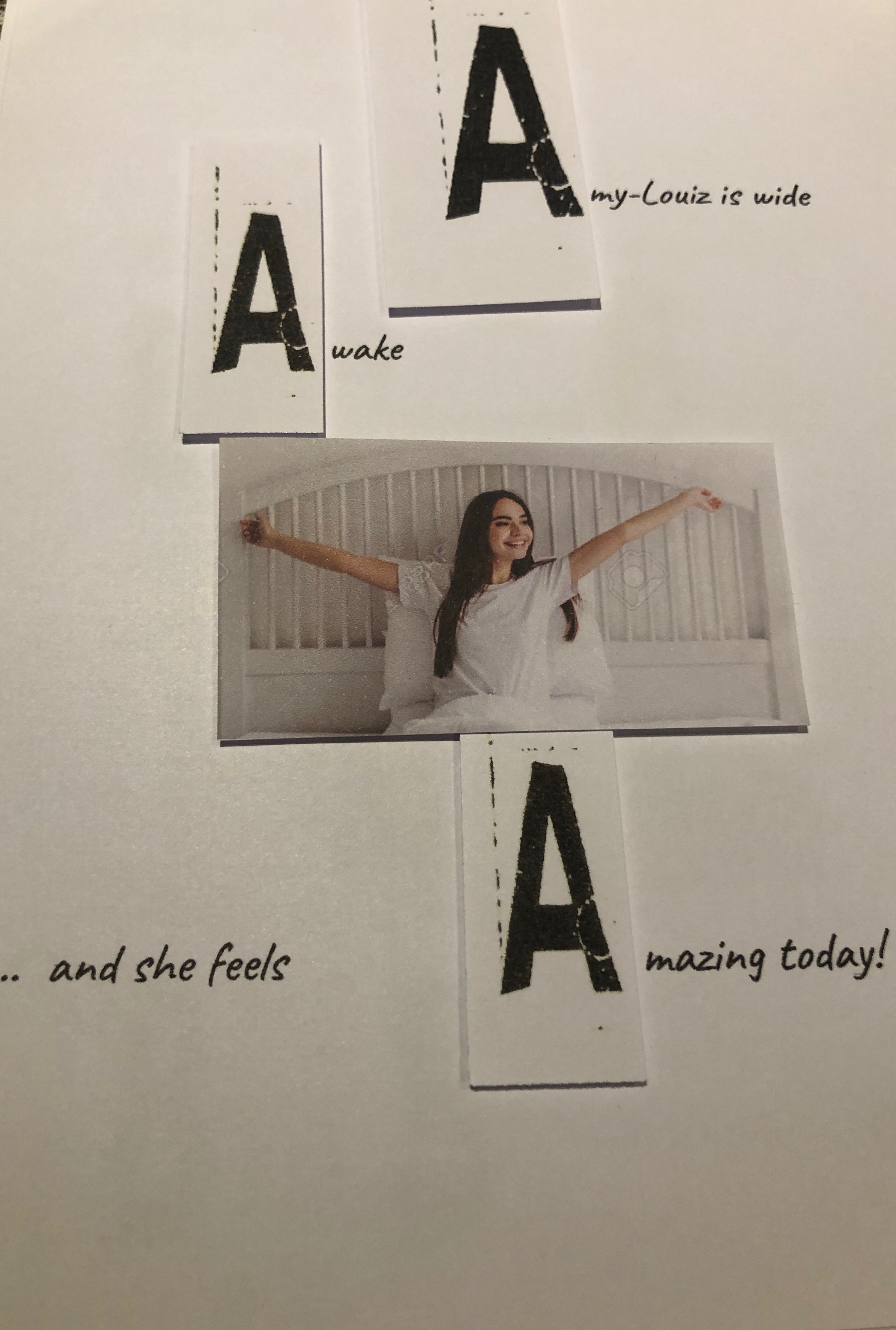 My little girl, Eden features in quite a few of the pages and here I have got her to lay on the floor in a couple of positions and taken photos of her, while stood on a chair. I have then super imposed them onto a black background, using an app on my phone (SuperImpose), added my lettering (TextArt) and printed it out on to gloss paper. The photos could have been of better quality but time was against me at this point.