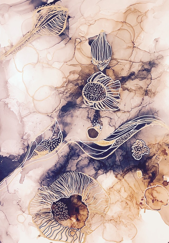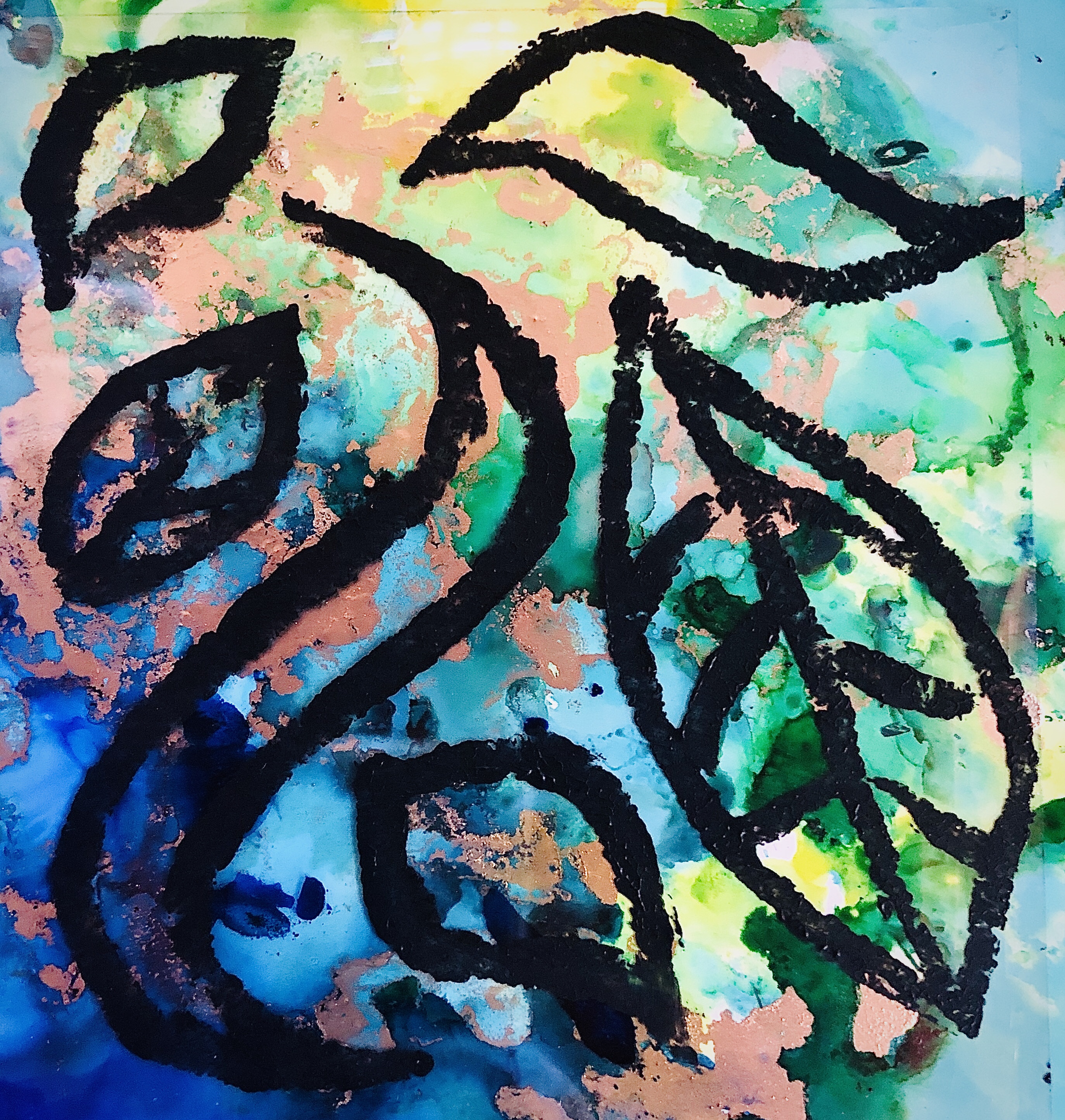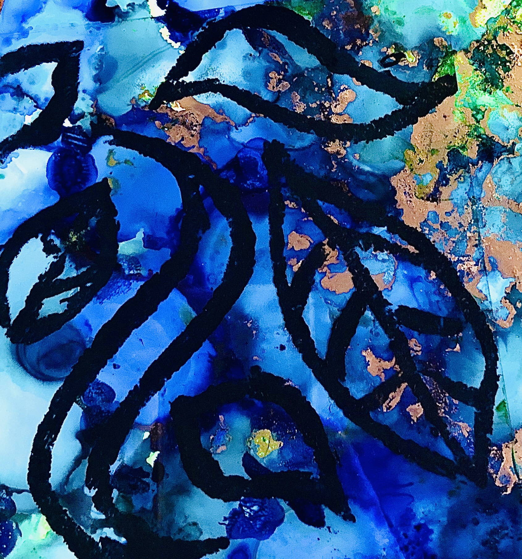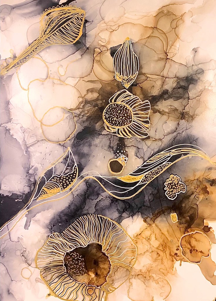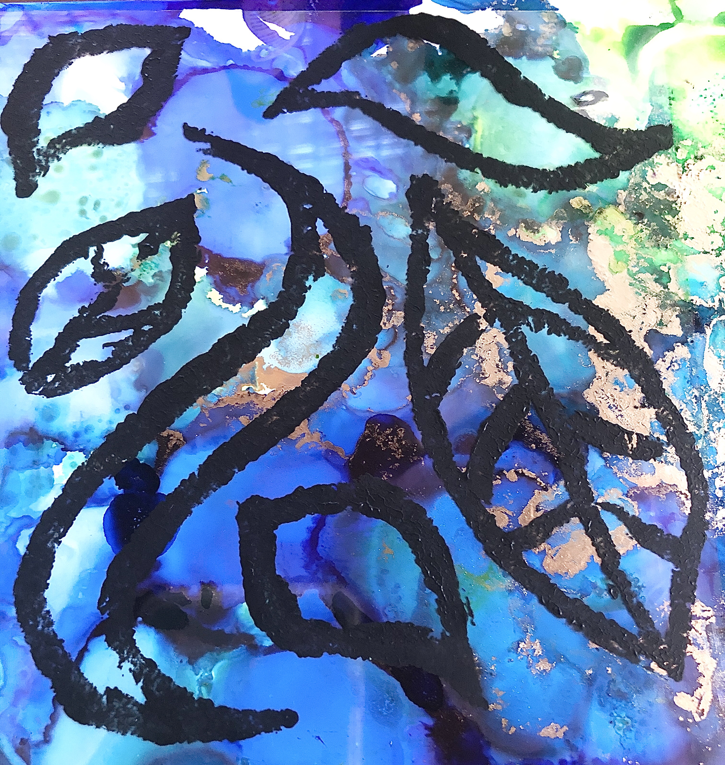 I love the use of ink and the effects and bleeds of fluid art. I’m using alcohol ink and A1 sheets of Yupo paper for my designs with a blending solution of isopropyl 99%. I’ve then worked over it with black, gold and white – Posca Paint pens (using images from the drawings of the figure eight…. and the ink drawings of the leaves in my ‘near, distant’ work). I’ve then copied these huge pieces for an example of range.