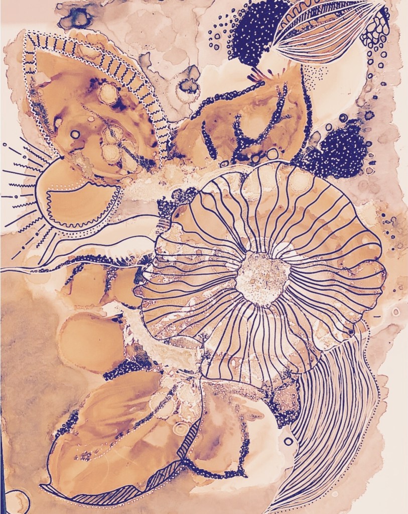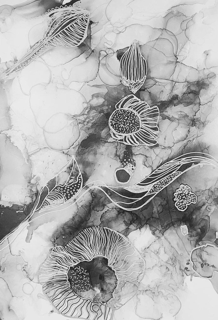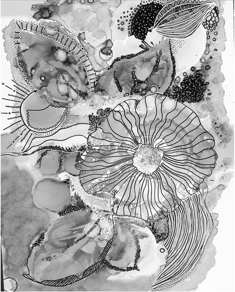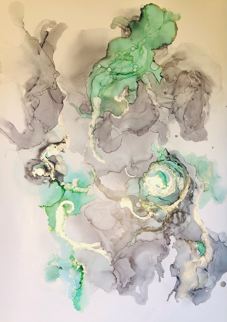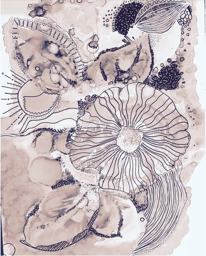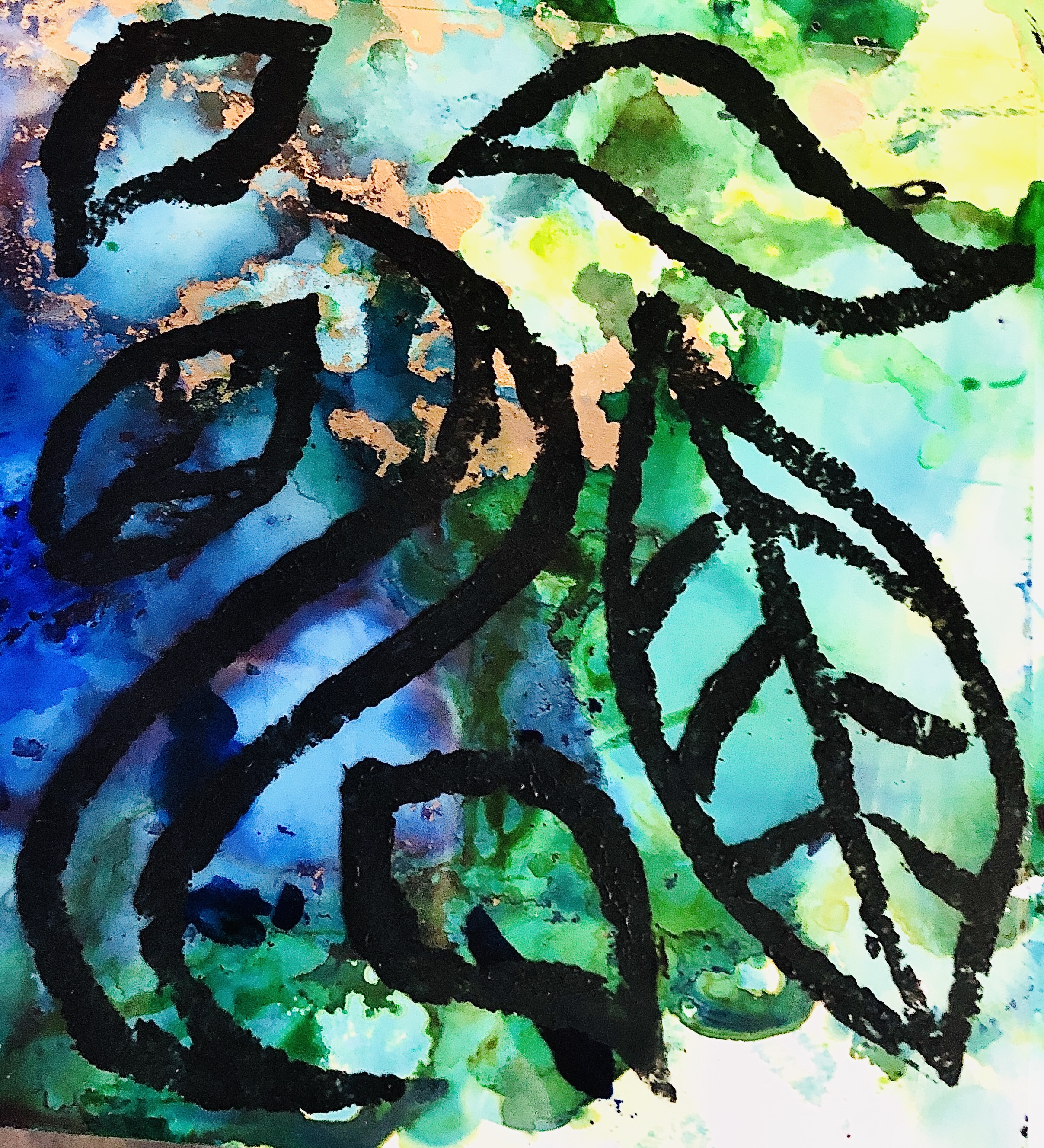 I love the use of ink and the effects and bleeds of fluid art. I’m using alcohol ink and A1 sheets of Yupo paper for my designs with a blending solution of isopropyl 99%. I’ve then worked over it with black, gold and white – Posca Paint pens (using images from the drawings of the figure eight…. and the ink drawings of the leaves in my ‘near, distant’ work). I’ve then copied these huge pieces for an example of range.