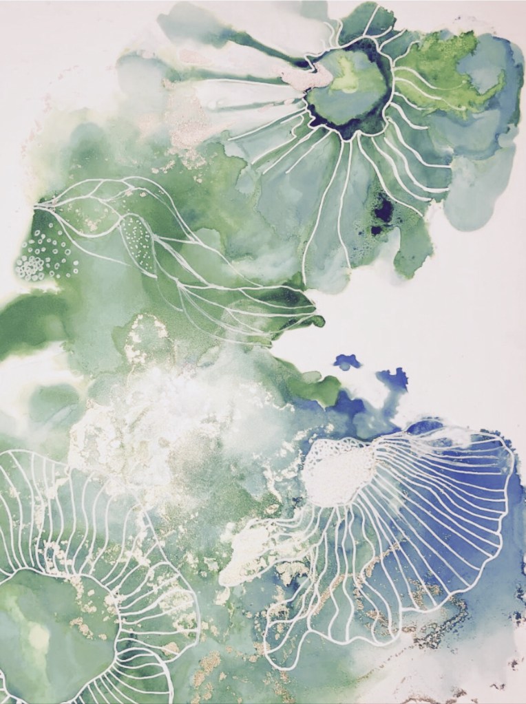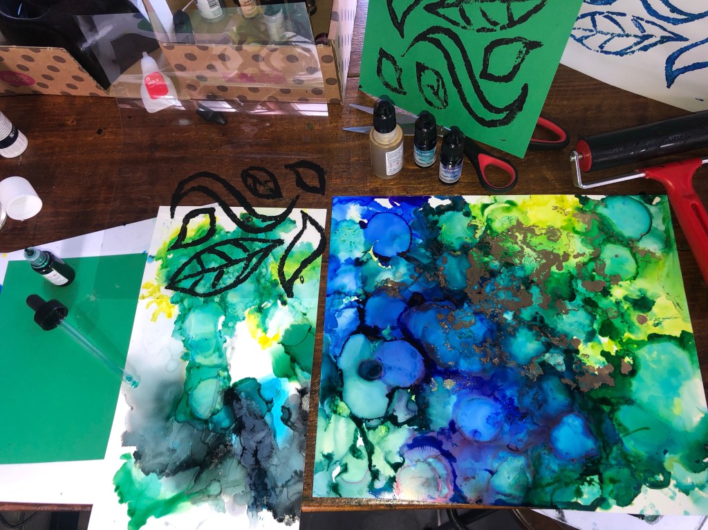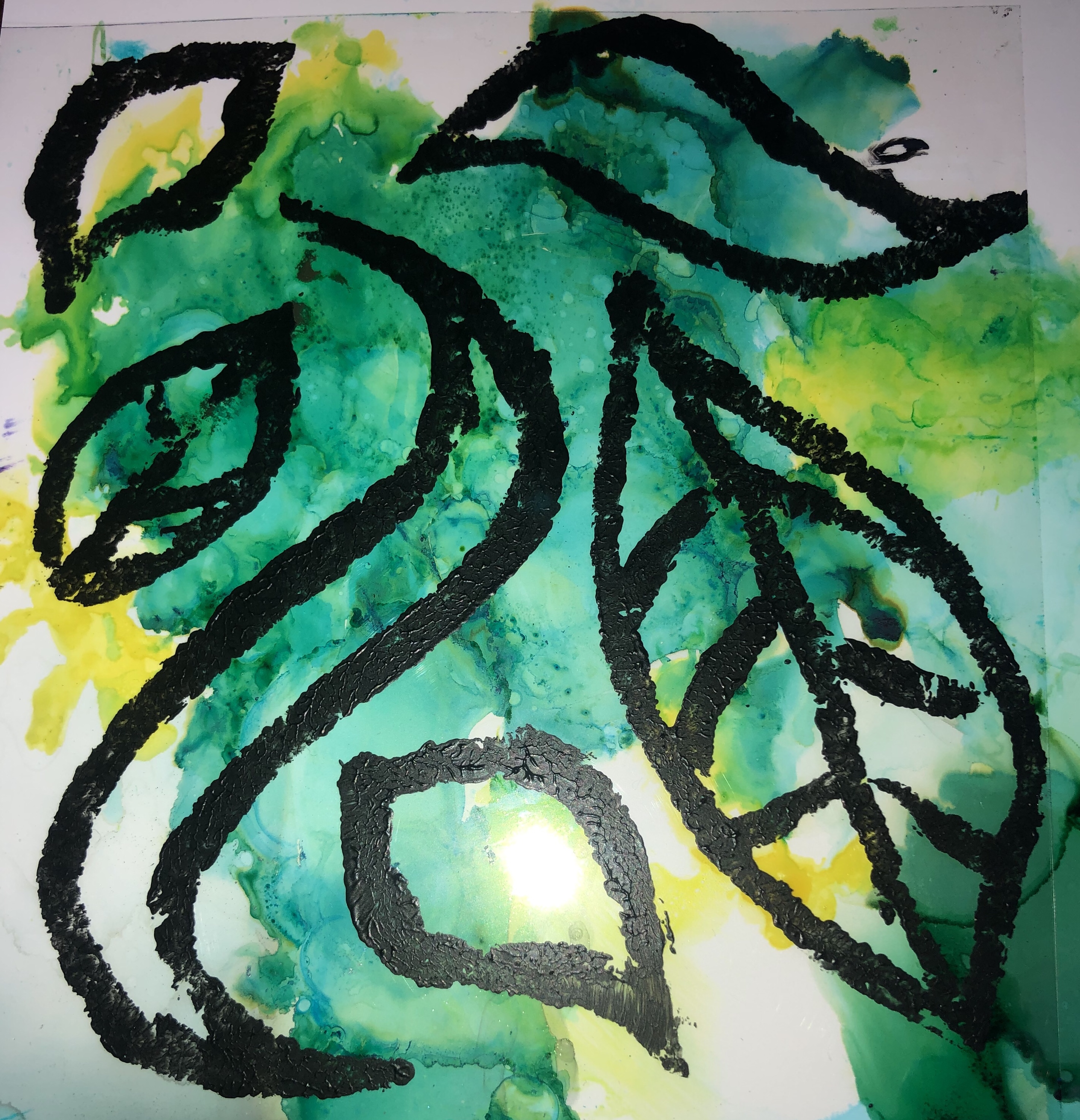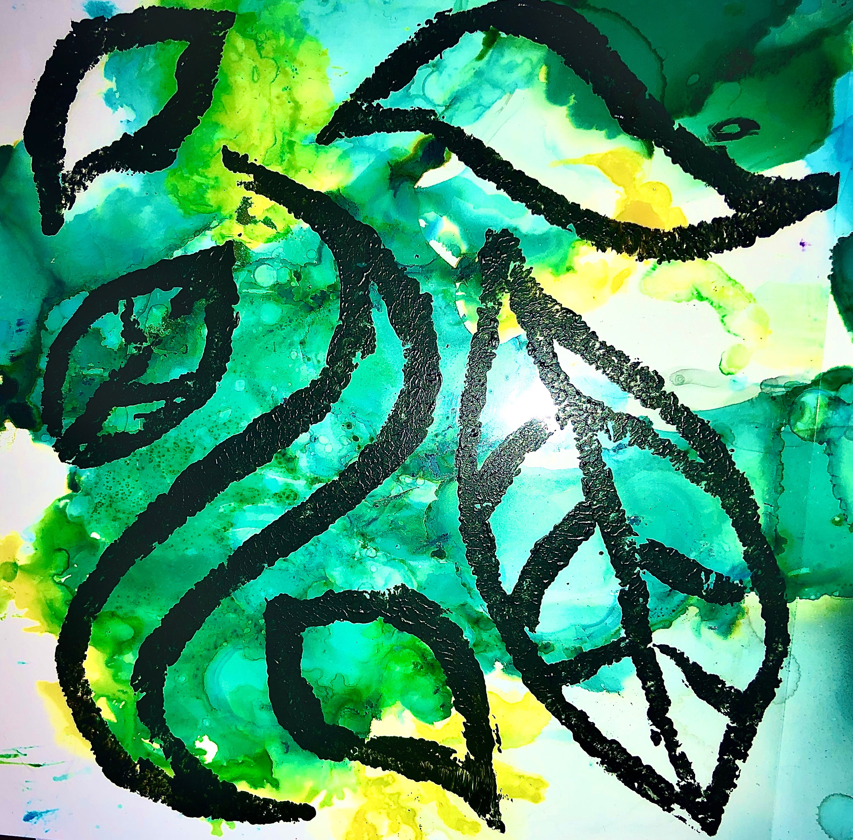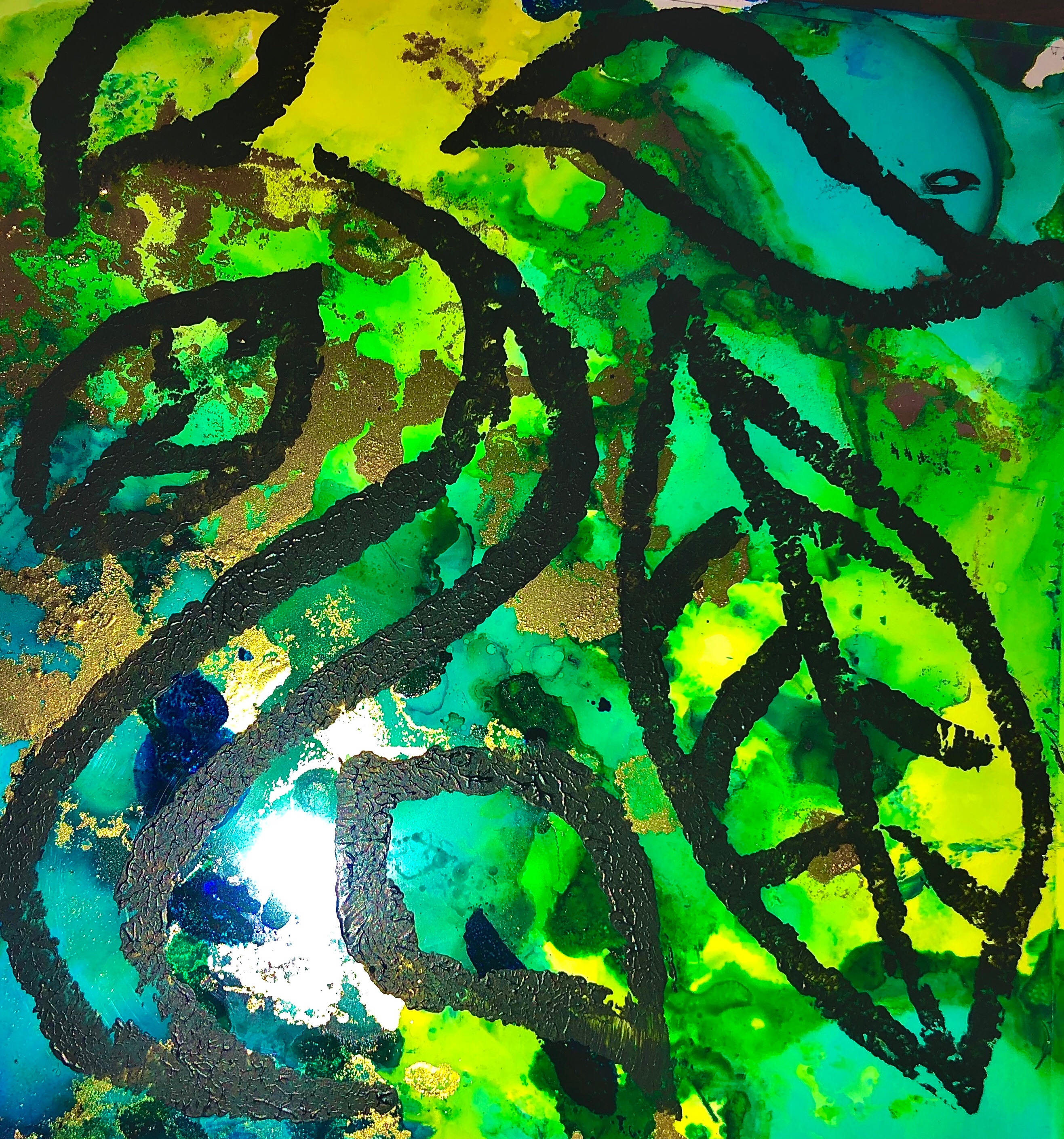 I love the use of ink and the effects and bleeds of fluid art. I’m using alcohol ink and A1 sheets of Yupo paper for my designs with a blending solution of isopropyl 99%. I’ve then worked over it with black, gold and white – Posca Paint pens (using images from the drawings of the figure eight…. and the ink drawings of the leaves in my ‘near, distant’ work). I’ve then copied these huge pieces for an example of range.