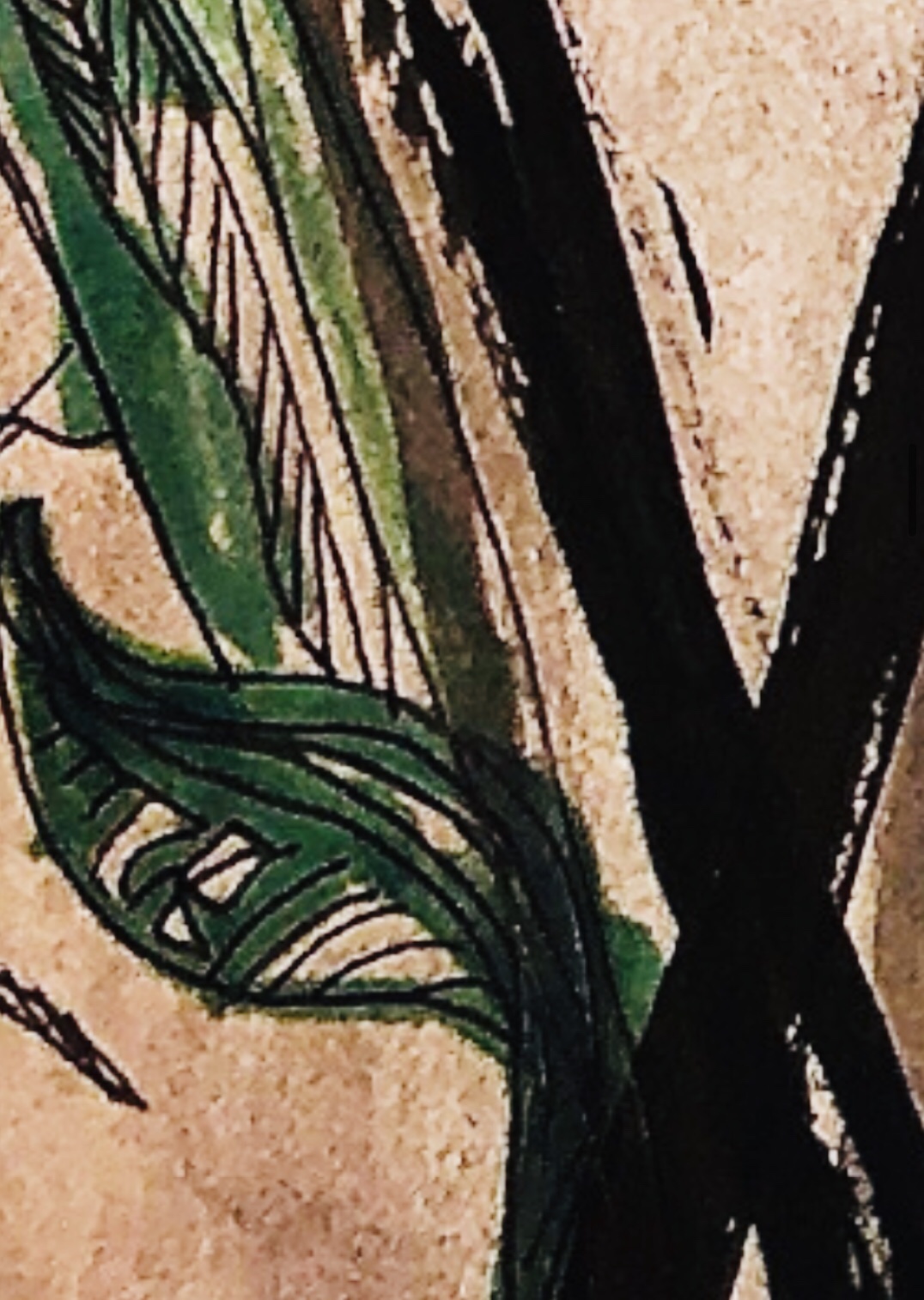 “Make one? VERTICAL long thin drawing that stretches downwards across two pages of your sketch book. Use your black ink, but also add one well-chosen colour in your drawing”.