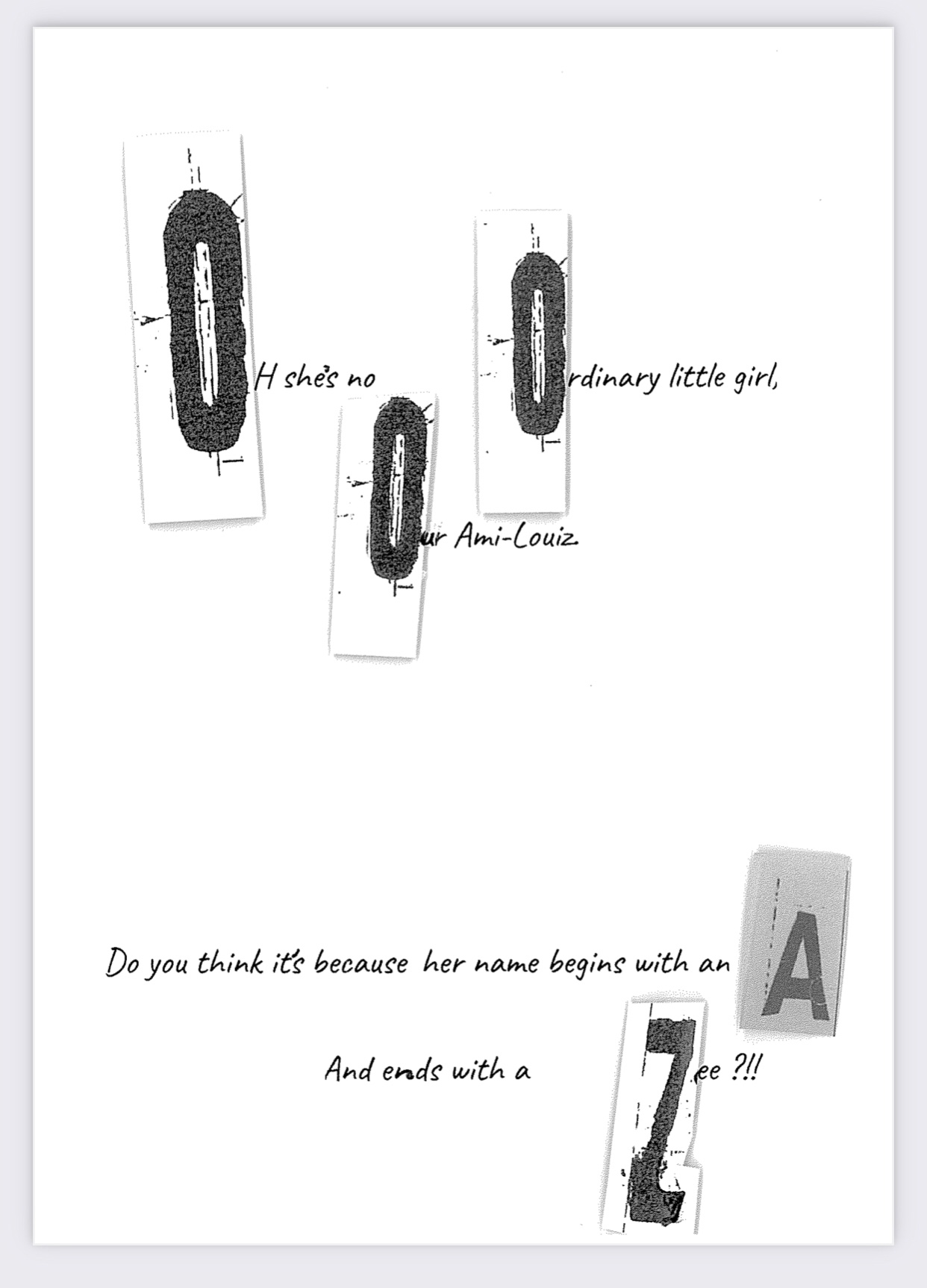 The little girls introduction contains the fact that her name begins with a name and ‘A’ and ends with a ‘Z’ee, but worded as if we are speaking of an object (which of course is the book …. Or the alphabet!) Also this ‘introduction’ happens in the midst of the story!
